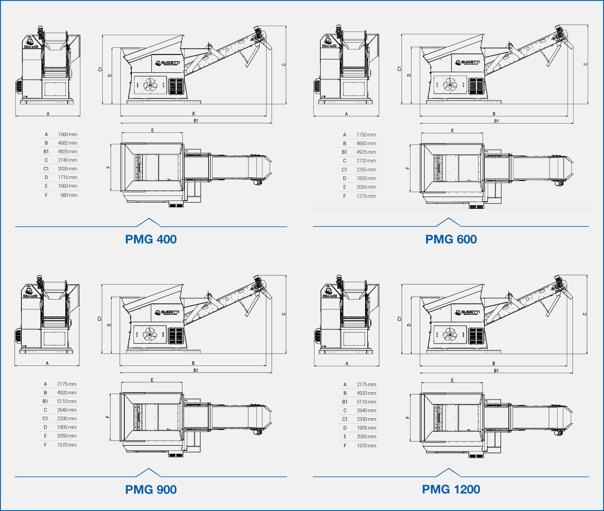 | PMG 900 | 2175 mm 85,6” | 4920 mm 193,7” | 2640 mm 103,9” | 2100 kg 4630 lb | 32,0 kw 42,9 HP | kg/h |