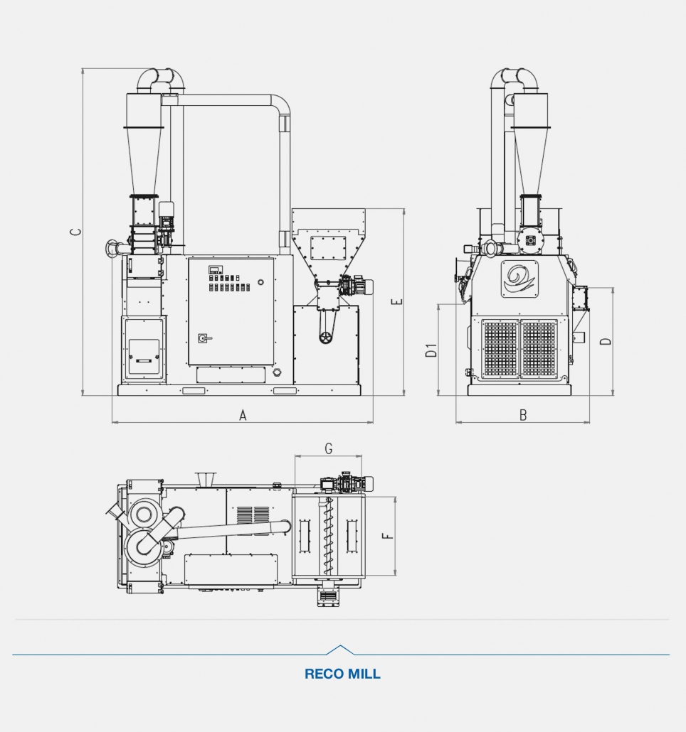 | RECO MILL 100 | 2875 mm | 1880 mm | 4193 mm | 3800 kg | 83,8 kg | 800-900 kg/h |