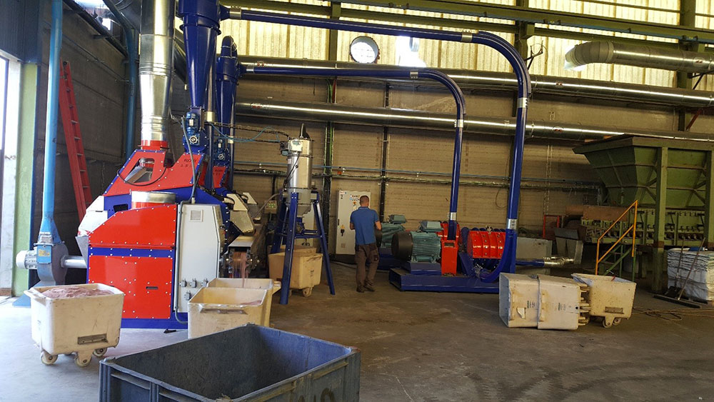 Linea doppia Guidetti composta da 2 polverizzatoriย Turbo625/4ย e 2 separatoriย Robi151, con produzione fino a 1200 kg/h, per recuperare al 100% il rame presente nella plastica a seguito del riciclaggio di cavi elettrici.